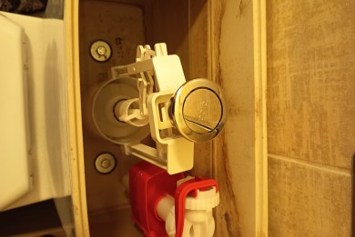 - Po spláchnutí hladina vody klesá a s ní i plovák, který táhne jeden konec páky dolů, a tím se uvolní přívod vody. Nádoba se napouští a hladina vody stoupá. Vztlaková síla, která působí na plovák, ho tlačí směrem nahoru, páka se dostává do vodorovné polohy, a tím je přívod vody uzavřen.