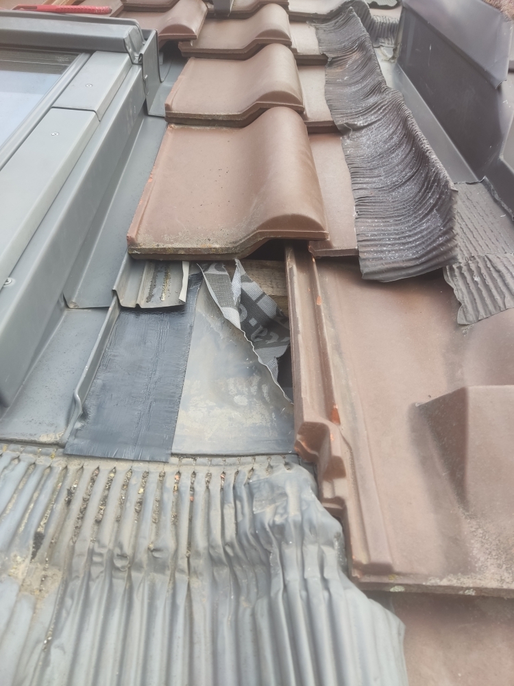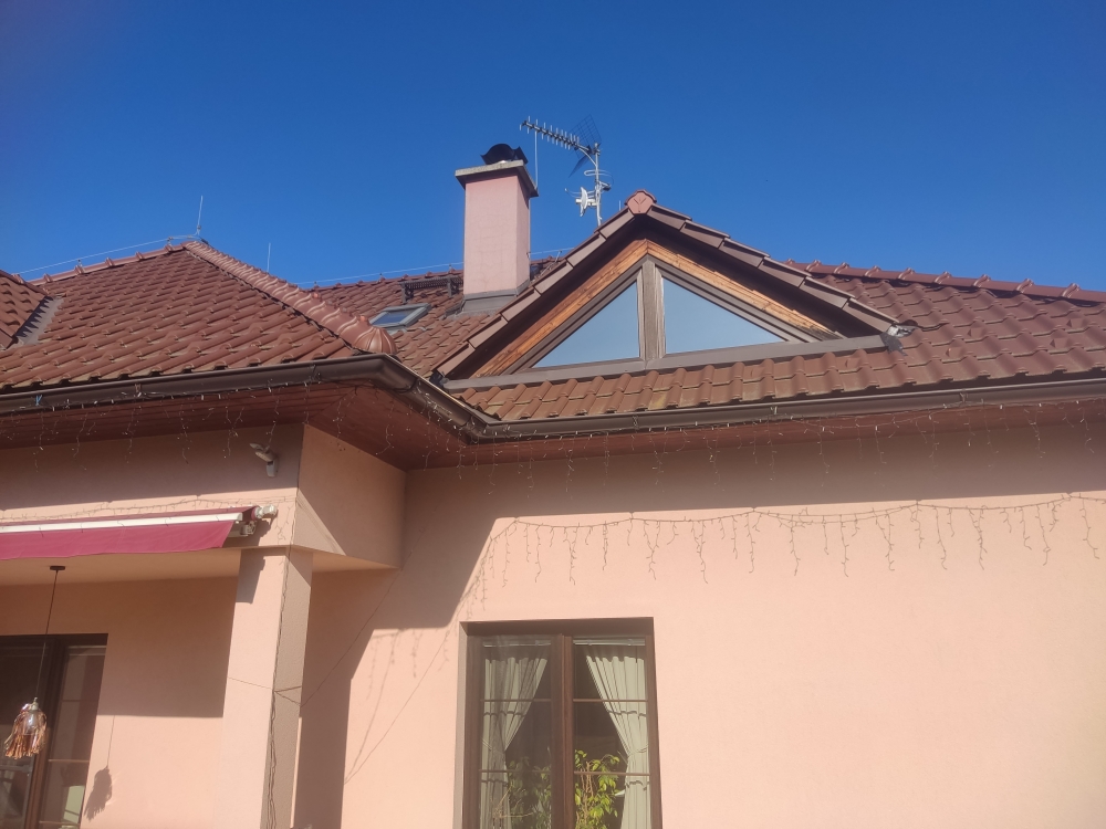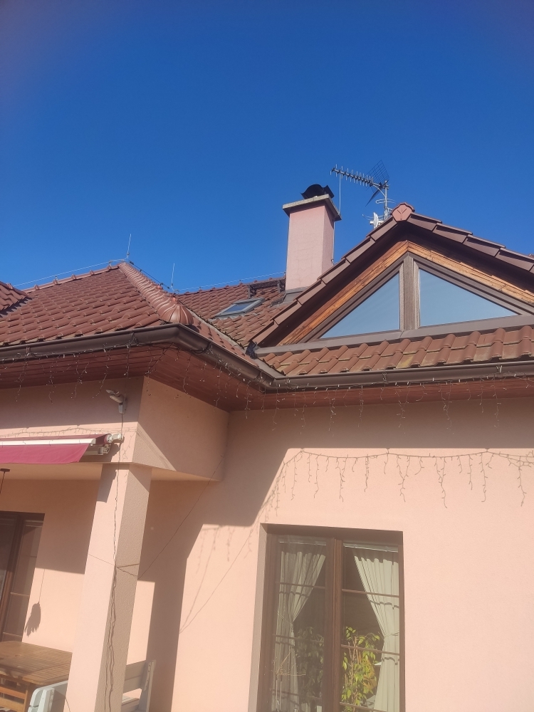 Pokrývači, Oprava střechy rodinného domu v místě zatékání, ve výšce přibližně 3 metry.