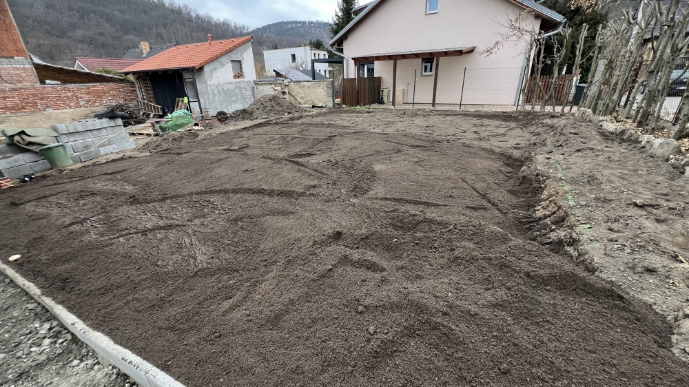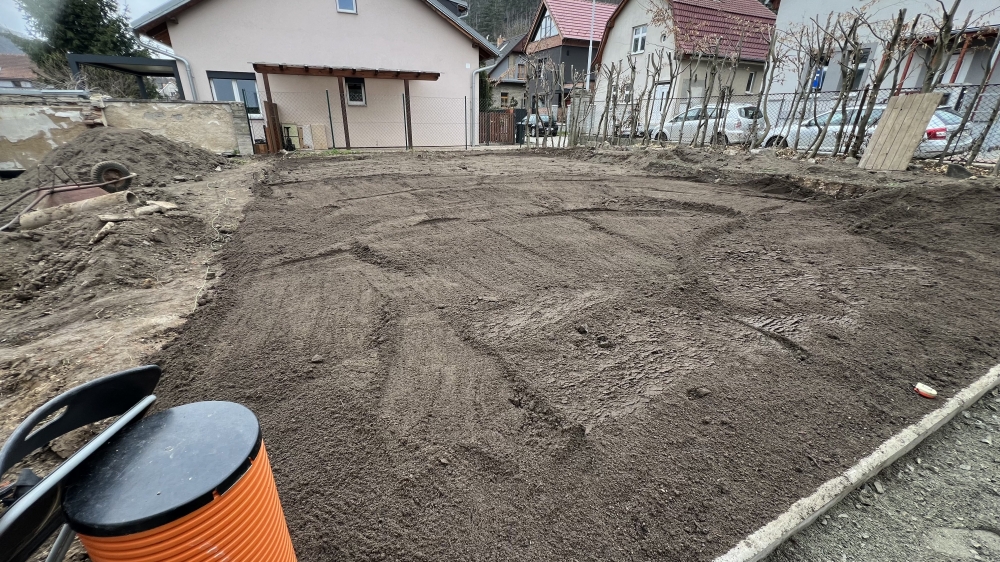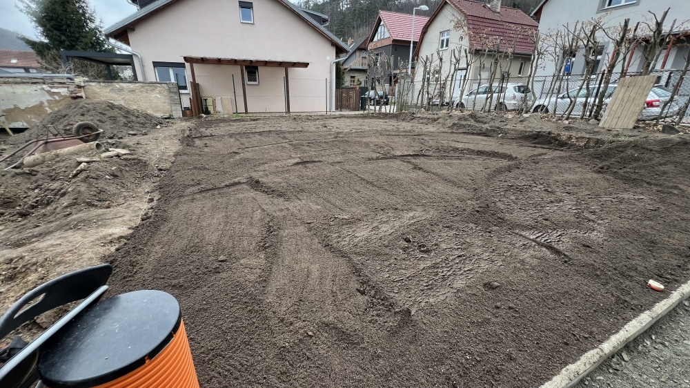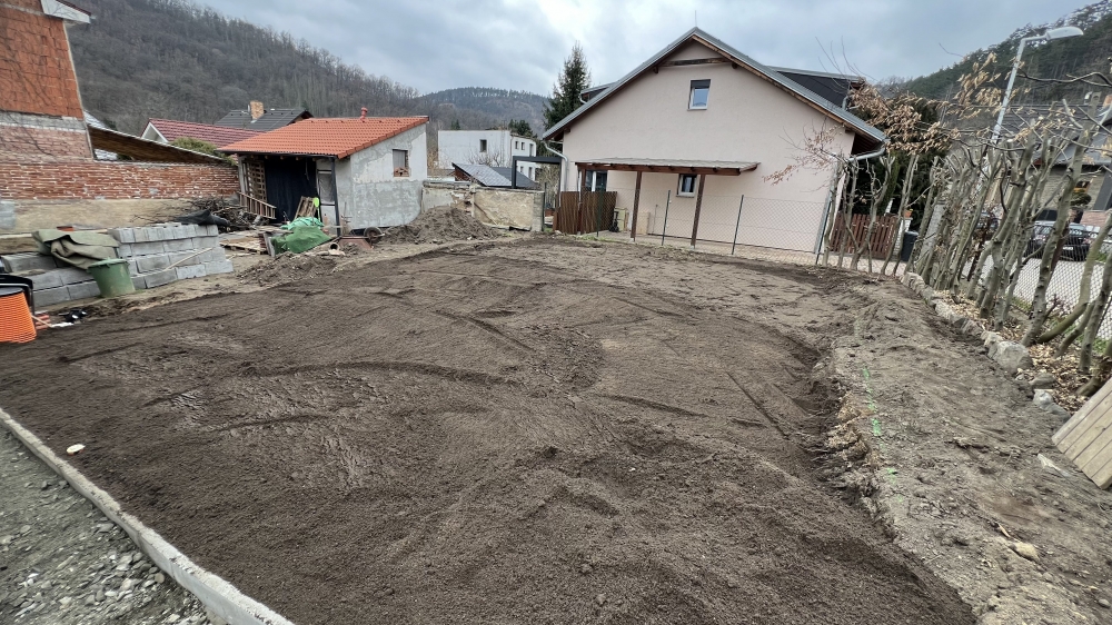 Vycištění a srovnání zahrady po stavbě, cca 400 m2.